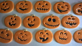 Once the black icing was dry, I outlined jack-o-lantern faces onto the cookies and the outside edges of the cookies. I left a small indent at the top so that I could add the pumpkins' brown stems and leaves later.